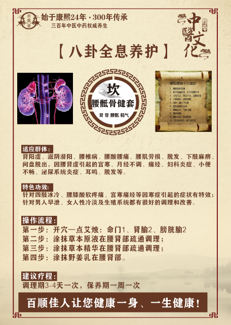使用人群: 肾阳虚引起的四肢冰凉、腰膝冷痛、畏寒怕冷、精神萎靡、小便清长、大便溏泄、 痛经量少闭经、男阳痿女宫寒性冷淡、早衰、胃寒胃痛、下肢水肿、肥胖、脱发、 免疫力低下、腰椎病、腰肌劳损、下肢麻痹、腰椎间盘突出、面色晦暗等人群。