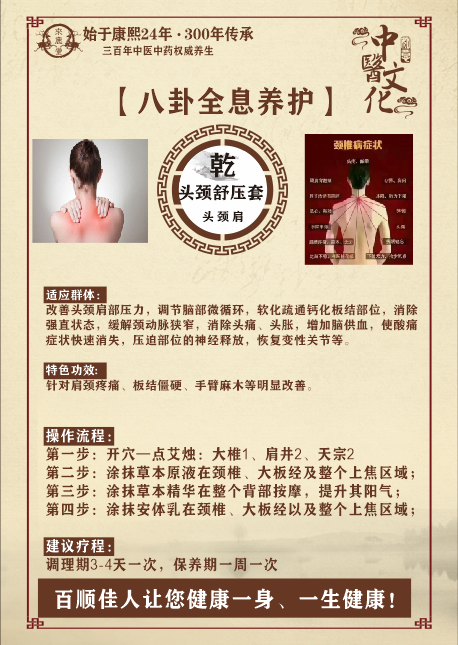 头颈肩不舒、头晕头痛、头胀眼花、肩部钙化板结、颈项强直、颈动脉狭窄、臂丛 神经压迫、肩周炎一臂不能上举、手指麻痹、颈椎关节变形、富贵包、轮胎颈、肩 胛骨缝疼痛等人群。